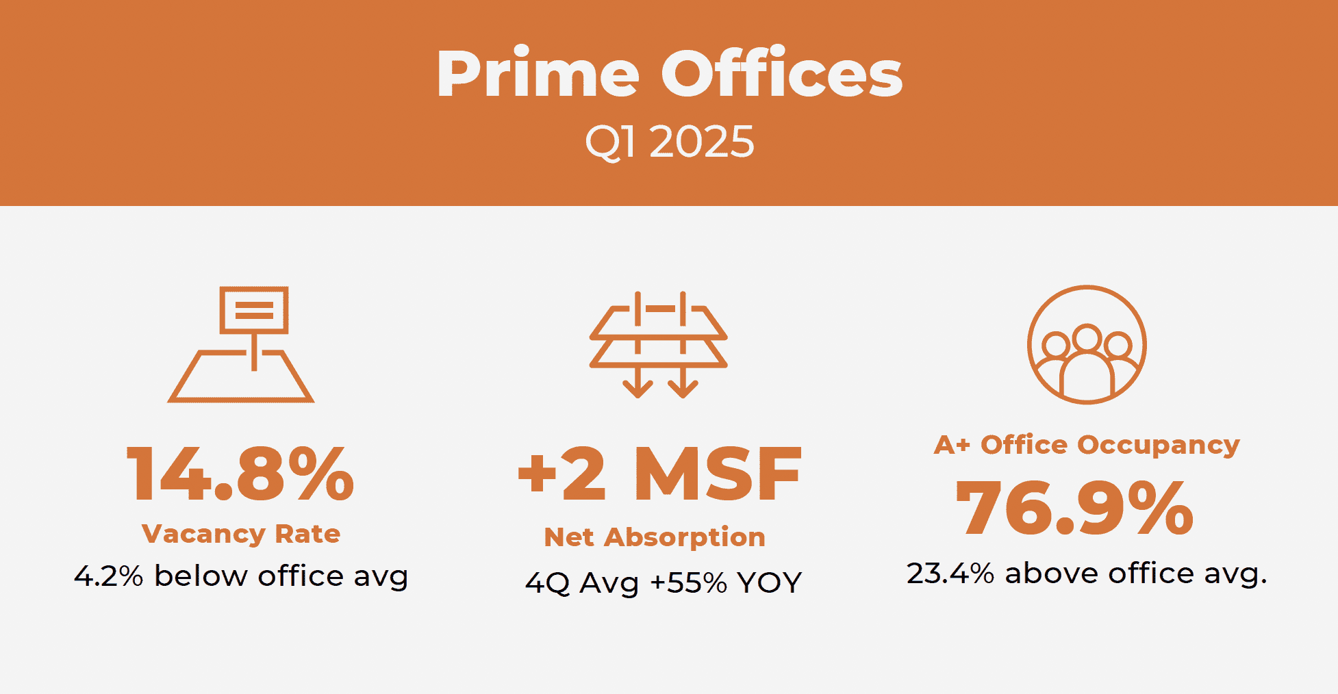 Class A and A+ office assets are faring much better than Class B and C buildings. In Q1 2025, the vacancy rate for prime office properties—Class A and AA buildings—was 14.8%, 4.2% below the overall office vacancy rate, reports CBRE.