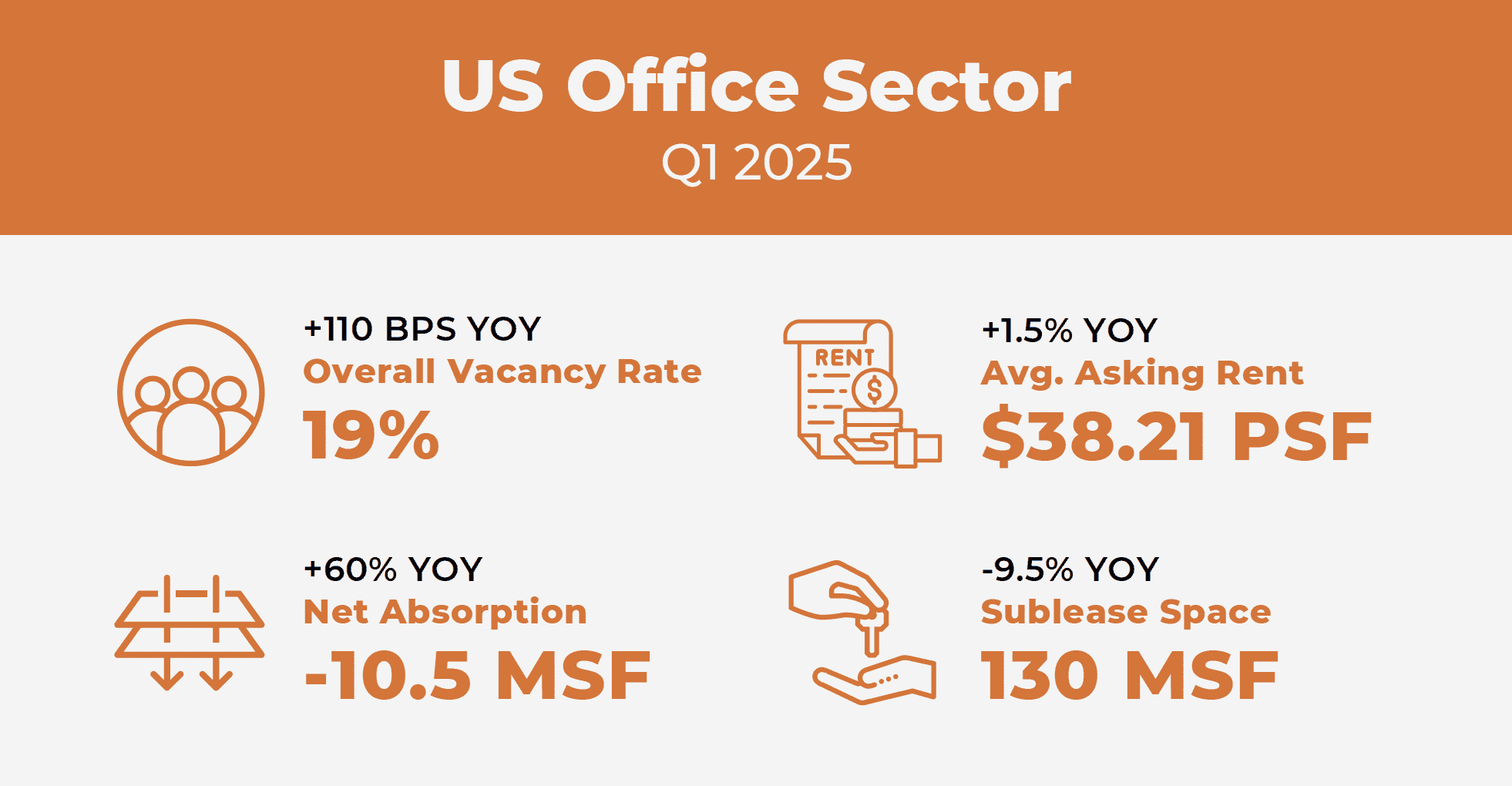 In Q1 2025, net absorption for the office sector was -10.5 MSF. The giveback was primarily due to the uptick in vacancies, including the wave of federal government lease terminations, and an increase in lease renewals, especially by larger tenants. While negative absorption is never a good thing, the rolling four quarter average was a 48% improvement YOY and net absorption was positive for a third of US markets.