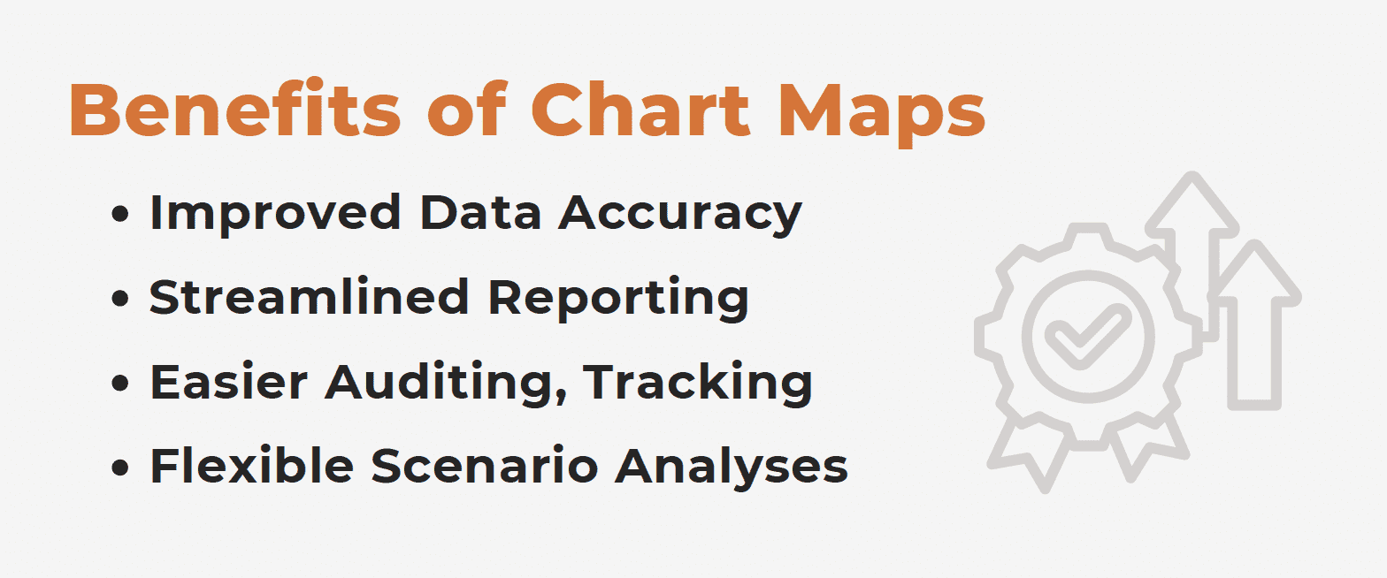 By mapping data to the correct accounts and ensuring consistent treatment of debits and credits, a chart map reduces the chance of errors when aggregating data from various sources. This is particularly important when dealing with financial data from accounting systems, where misclassifications can lead to inaccurate reporting.