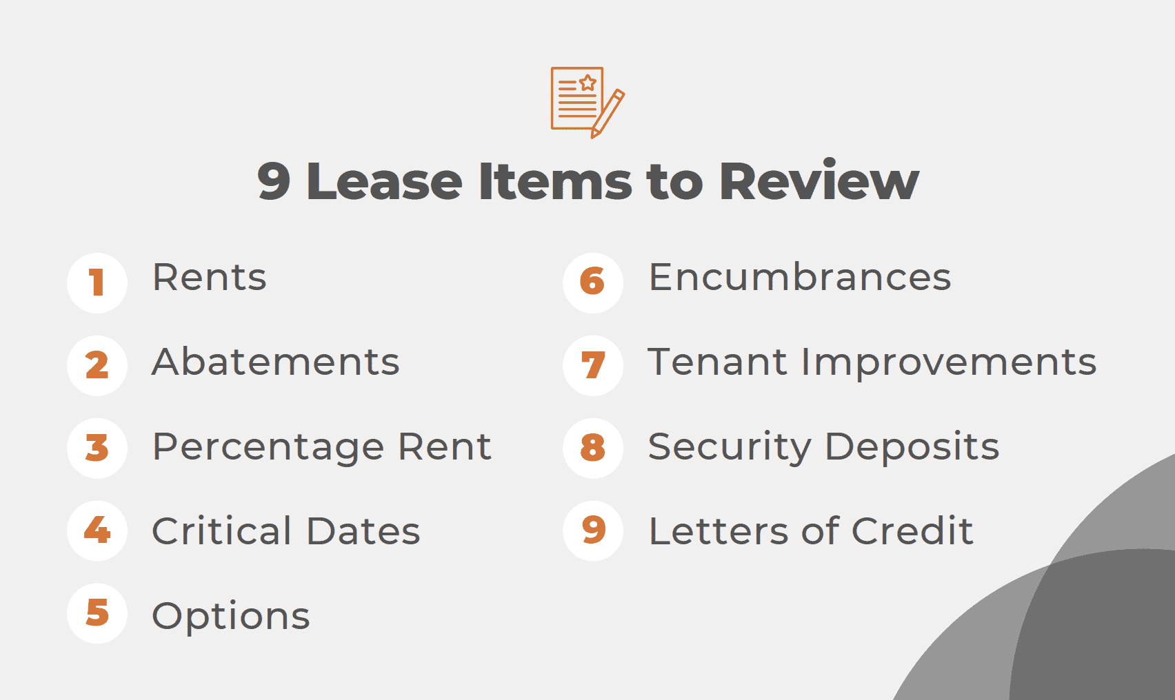 Finally, there’s The ABCs of Commercial Real Estate Leases, our thorough and detailed primer on commercial real estate leases, covering lease basics, rent, options and more. You’ll find that in our resources Library as well.