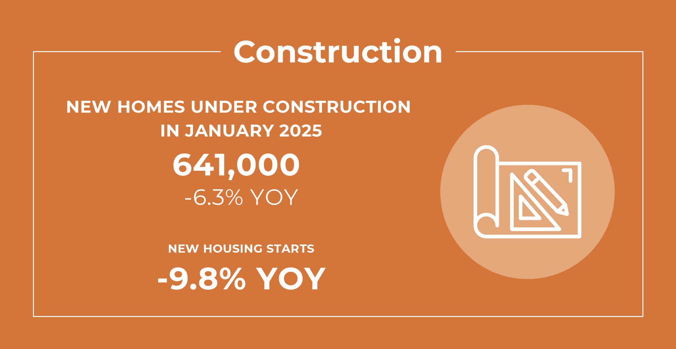 Home affordability—or lack thereof– and high construction costs have impacted new home construction. In January 2025, 641,000 new single-family homes were under construction, down 6.3% YOY, reports the National Association of Home Builders.