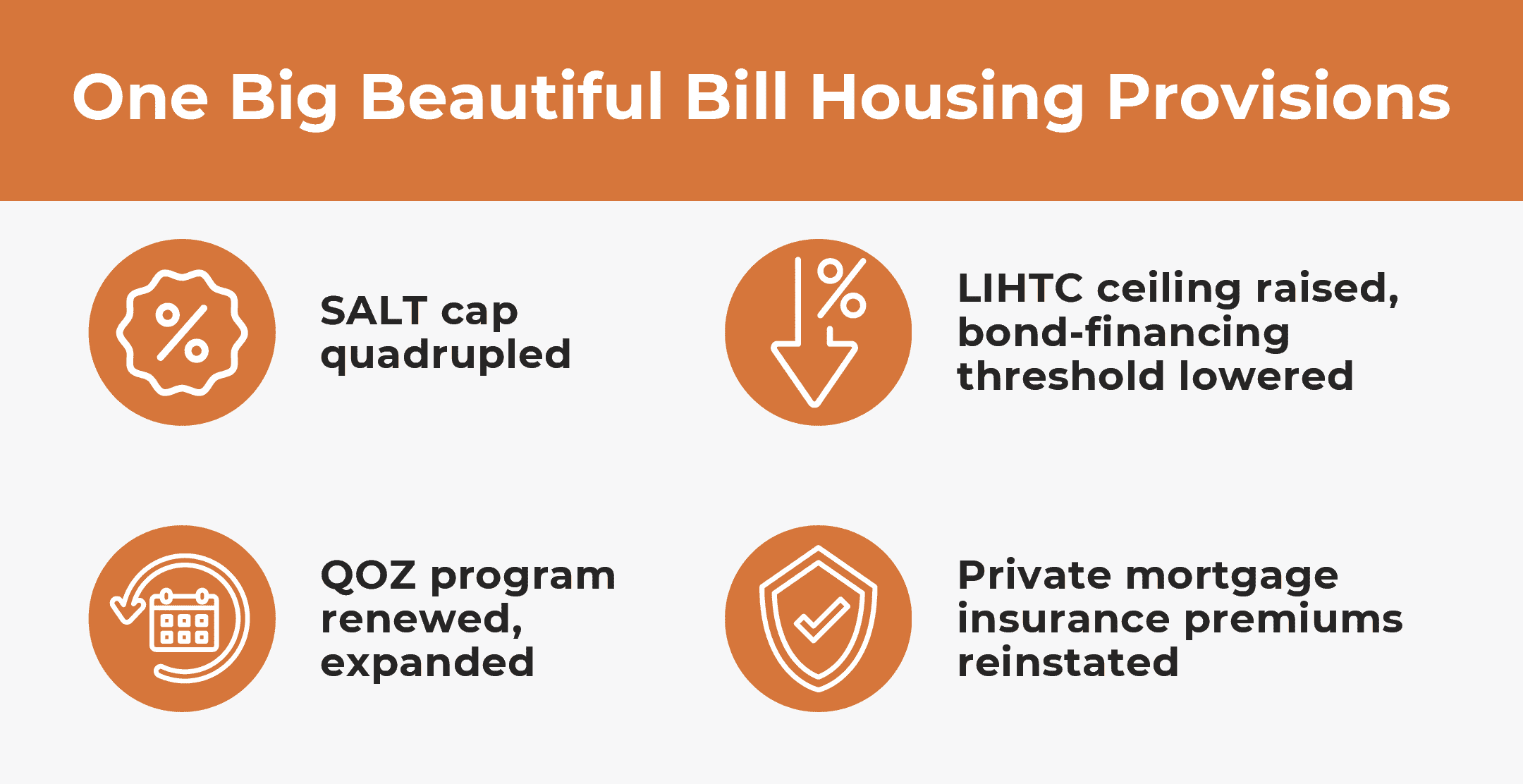 While the housing market’s struggles have helped the multifamily sector, residential real estate should receive a big boost from the many economic and housing stimulus measures included in the “One Big Beautiful Bill Act”, the massive, 870-page, $2.4 trillion tax and spending bill recently approved by both the House and Senate and signed into law by President Trump in a July 4th White House ceremony.