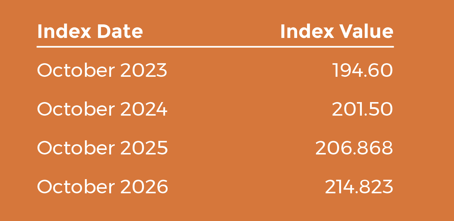 To calculate subsequent Base Rent increases, you’d follow the same process, but use the last CPI data published before each scheduled rent increase, so the Index published in October 2025, October 2026 and so on.