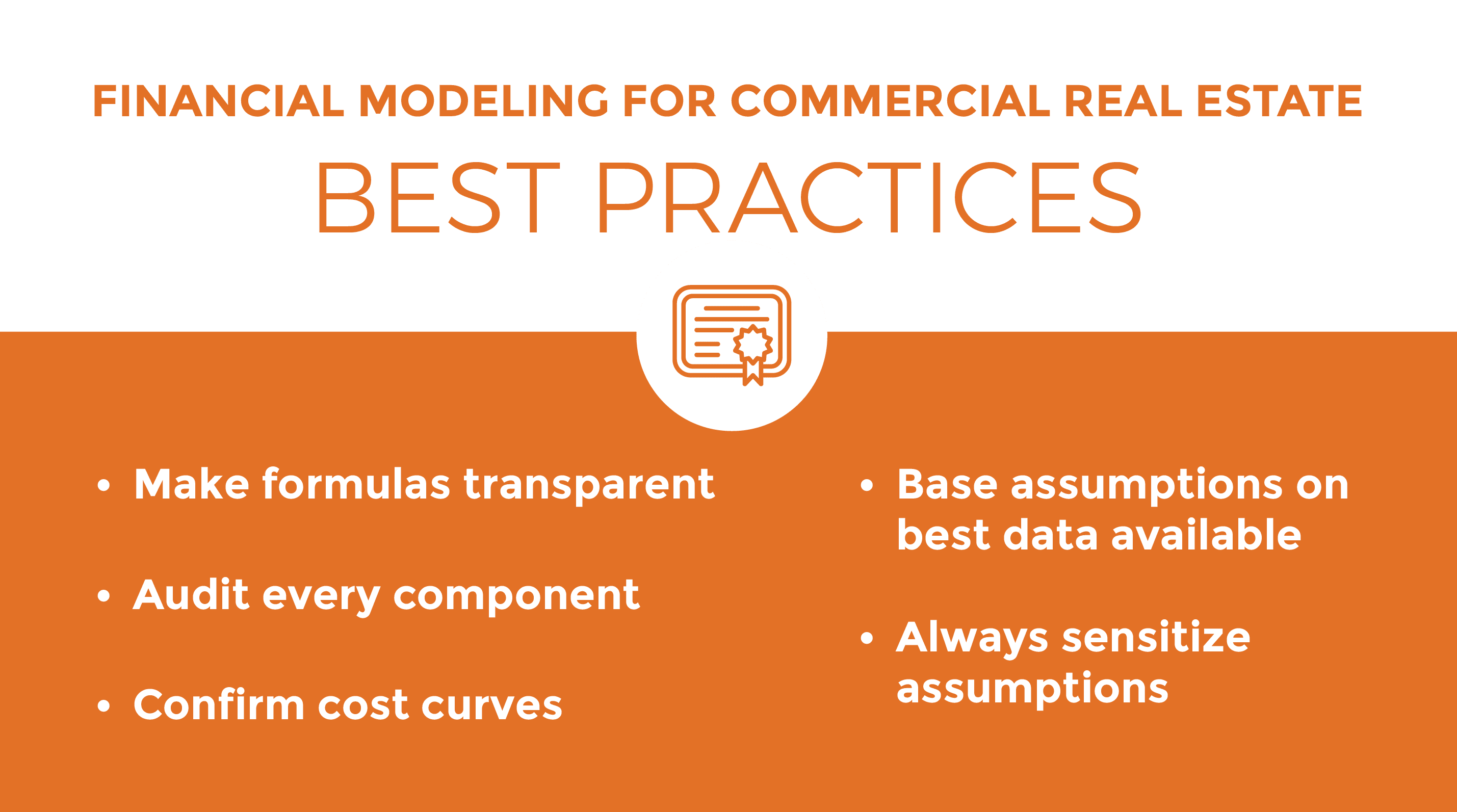 Based on our 30 years of experience modeling commercial real estate development projects, the model’s formulas should be transparent so it’s plain to see how numbers were calculated. All components, from the rent roll and debt and timing elements to debt and equity waterfall calculations, should be meticulously audited to check for errors or missing data, which can have a domino effect and completely throw off the outcomes. Cost curves should be confirmed, especially if they’re customized. Assumptions should be based on the best available data, then sensitized to show an array of possible outcomes.