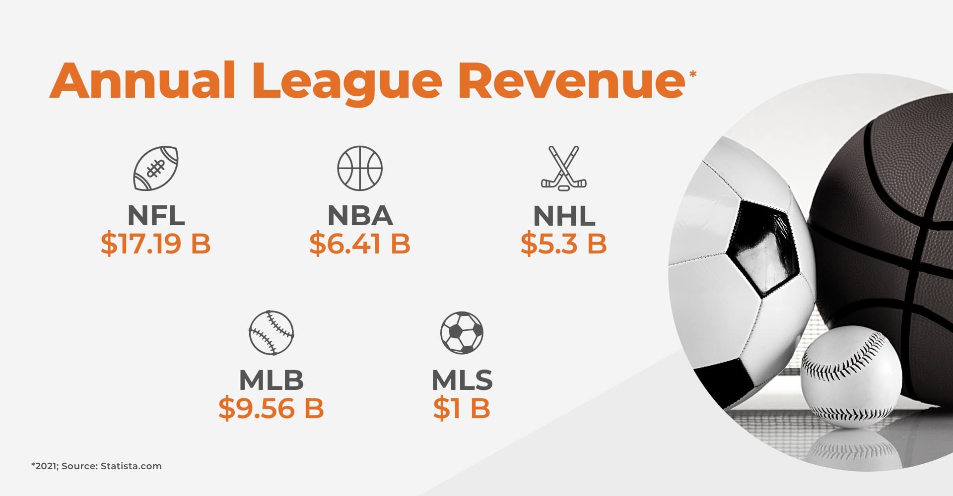 In the US, revenue varies greatly by sports league. In 2021, among North America’s five major professional sports leagues: