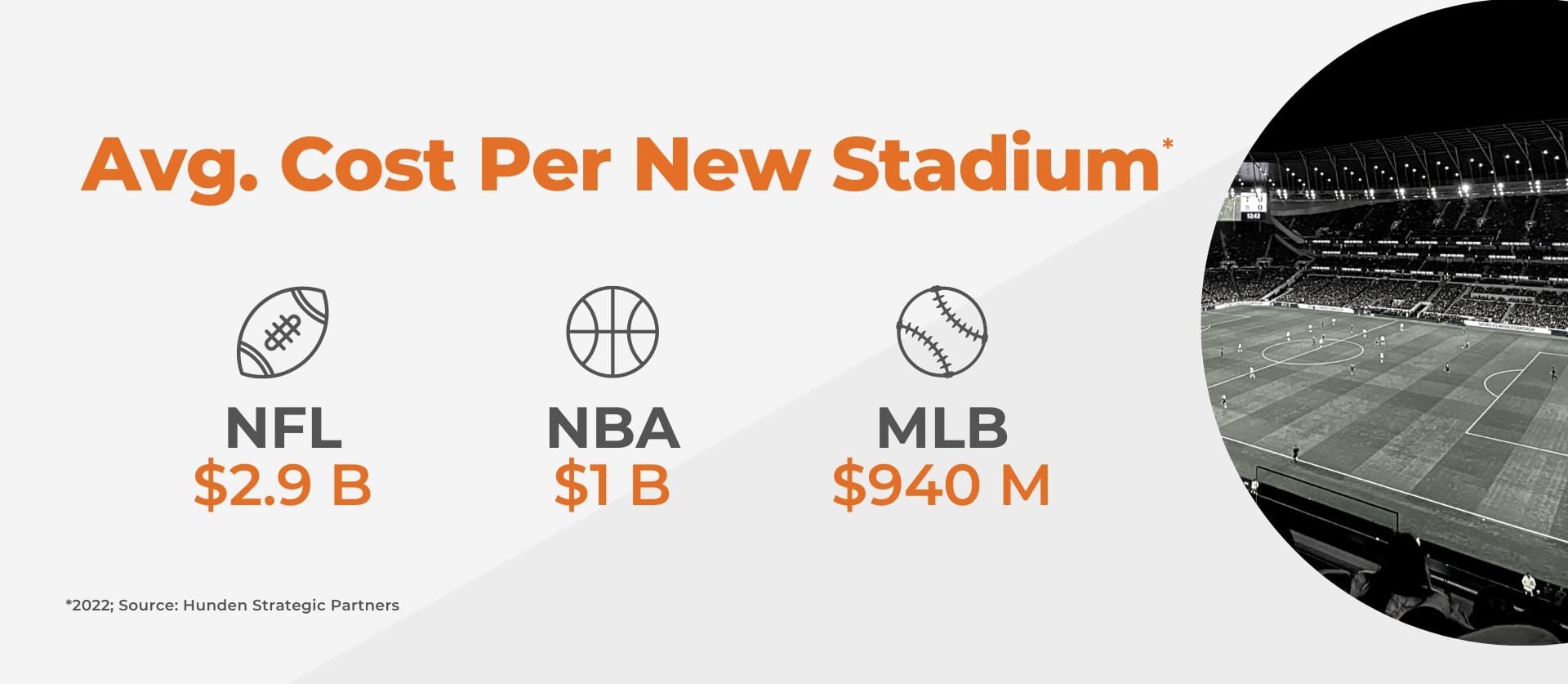 A big part of the reason so much is being spent on new stadium construction is the average cost of new stadiums has been steadily increasing. The average cost of a new NFL stadium is now up to around $2.9 billion, an NBA arena $1 billion and an MLB stadium a cool $940 million33.