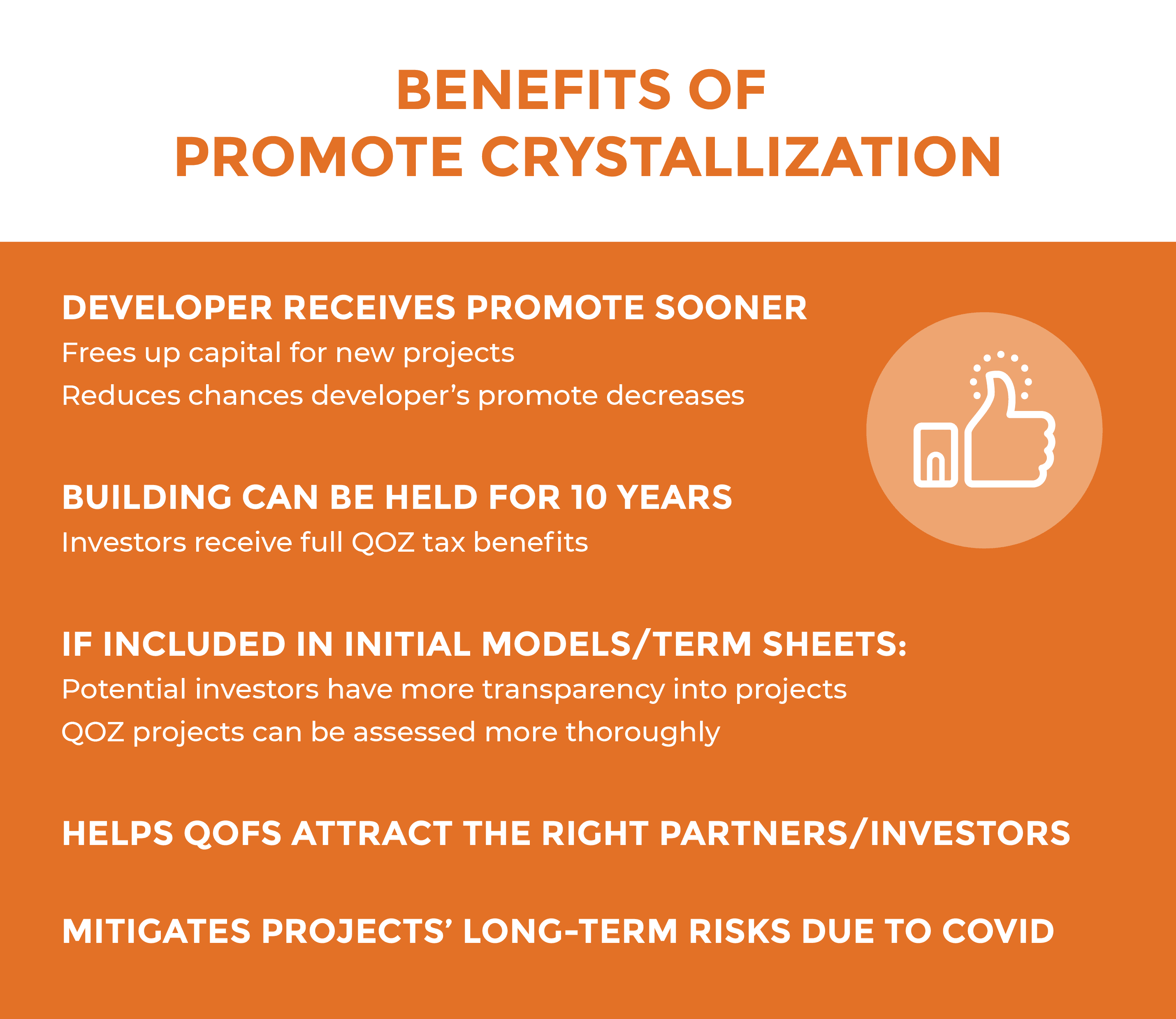 Qualified Opportunity Zone Funds also can use crystallized promote to attract and bargain with new developers and investors as the fund grows and new deals are added.