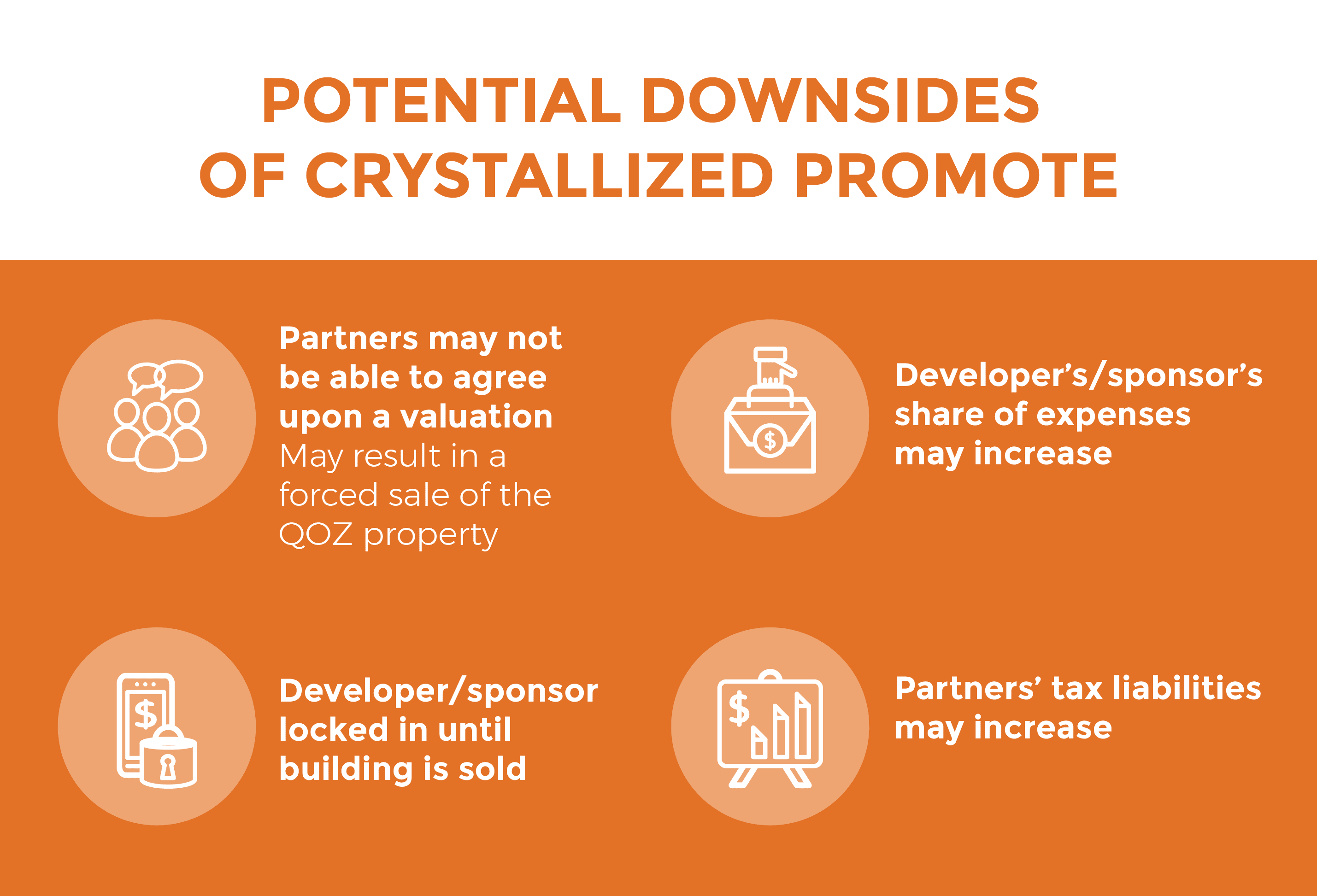 As with any complex financial transaction involving multiple parties, promote crystallization has some potential downsides for QOZ developers, investors and funds as well, the biggest being coming up with a valuation for the property that all parties can agree upon.